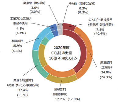 まず、住宅や建築物を利用することによる二酸化炭素の排出量(2020年度)は、商業やサービス業などの「業務その他部門」で1億8,200万トン(17.4%)、「家庭部門」で1億6,600万トン(15.9%)にのぼります。これらを合わせると33%で、全体の3分の1に当たります。これは、もっとも多い「産業部門(34.0%)」に次いで大きなウェイトです。