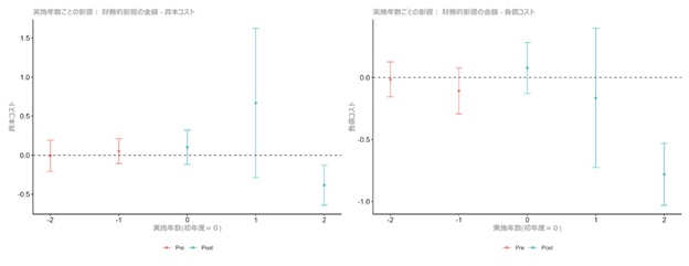 定量開示実施年数ごとの、資本コストへの影響(左)と負債コスト(右)への影響。