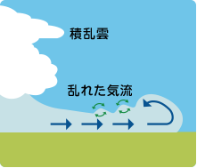 積乱雲の下で形成された冷たい(重い)空気の塊が、その重みにより温かい(軽い)空気の側に流れ出すことによって発生します。