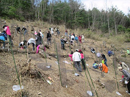 2月22日に引き続き、今春2回目の植樹祭を行いました。参加者は4ヶ所に分かれ、植樹とシカの食害防止用サプリガードの取り付け方を聞いた後、思い思いの場所に移動して植樹を開始。