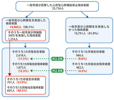 2017年中の消防庁のデータによると、救急隊が到着するまでに、一般市民によって心肺蘇生が施された心肺機能停止状態(心臓が原因)の傷病者は14,965人でしたが、心肺蘇生されなかったケースに比べると1か月後の生存率は約2倍にもなりました。社会復帰率に至っては、約3倍近くの開きがあります。