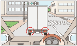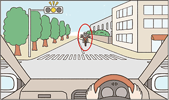 『バイクはまだ遠いし、黄色信号で止まるだろう』と考えていると、直進二輪車と衝突する可能性があります。二輪車は実際よりも遠くに見えやすいことに加え、双方が黄色信号に焦って通過しようとすることもあります。『二輪車が交差点内に入ってくるかもしれない』と考え、減速または停止をして相手車両の動きを確認しましょう。