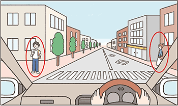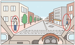 『渡ろうとする歩行者はいないだろう』と考えていると、人身事故を起こす可能性があります。信号のない横断歩道に近づいたとき、横断する人がいるかどうか明らかでない場合や歩行者が横断歩道を渡るか判断に迷う場合には、いつでも止まれる速度で進行し、歩行者の動向に注意しましょう。