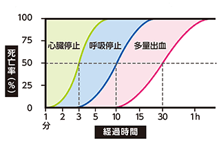 現場到着所要時間(119番通報を受けてから現場に到着するまでに要した時間)の平均は年々延伸傾向にあり、2022年では約10.3分、2023年では約10.0分と、2年連続で10分台を記録しています(図1)。これには様々な要因が影響していますが、その一因に交通渋滞や緊急自動車の走行への妨害があると考えられます。死亡率は心臓停止後約3分で50%、呼吸停止後約10分で50%、多量出血後約30分で50%に達するといわれており、時間の経過とともに死亡率が高まるため、1分、1秒でも早く救命処置を行うことが重要です(図2)。交通参加者が適切に行動することで、現場到着に要する時間を短縮し、多くの命を救うことができます。