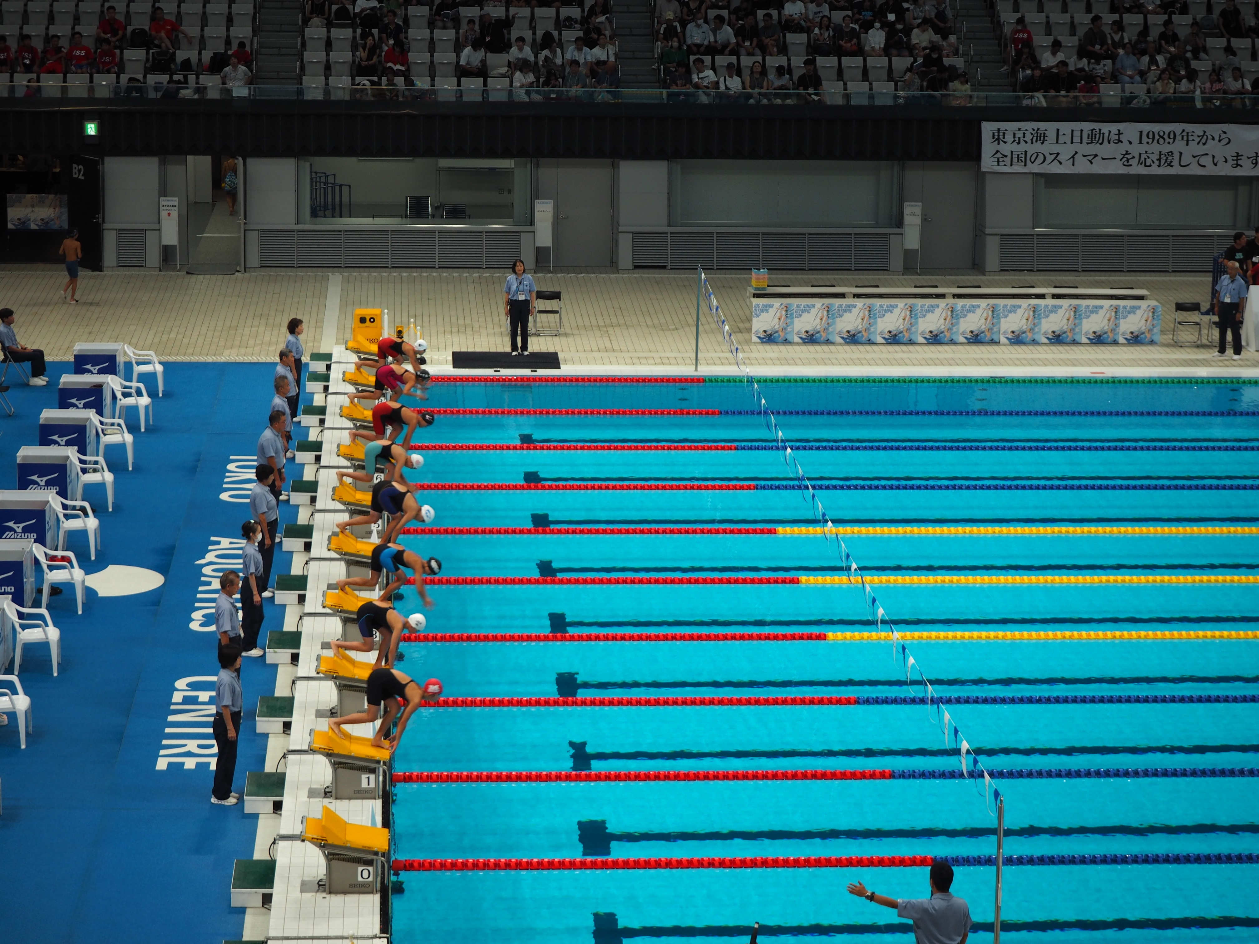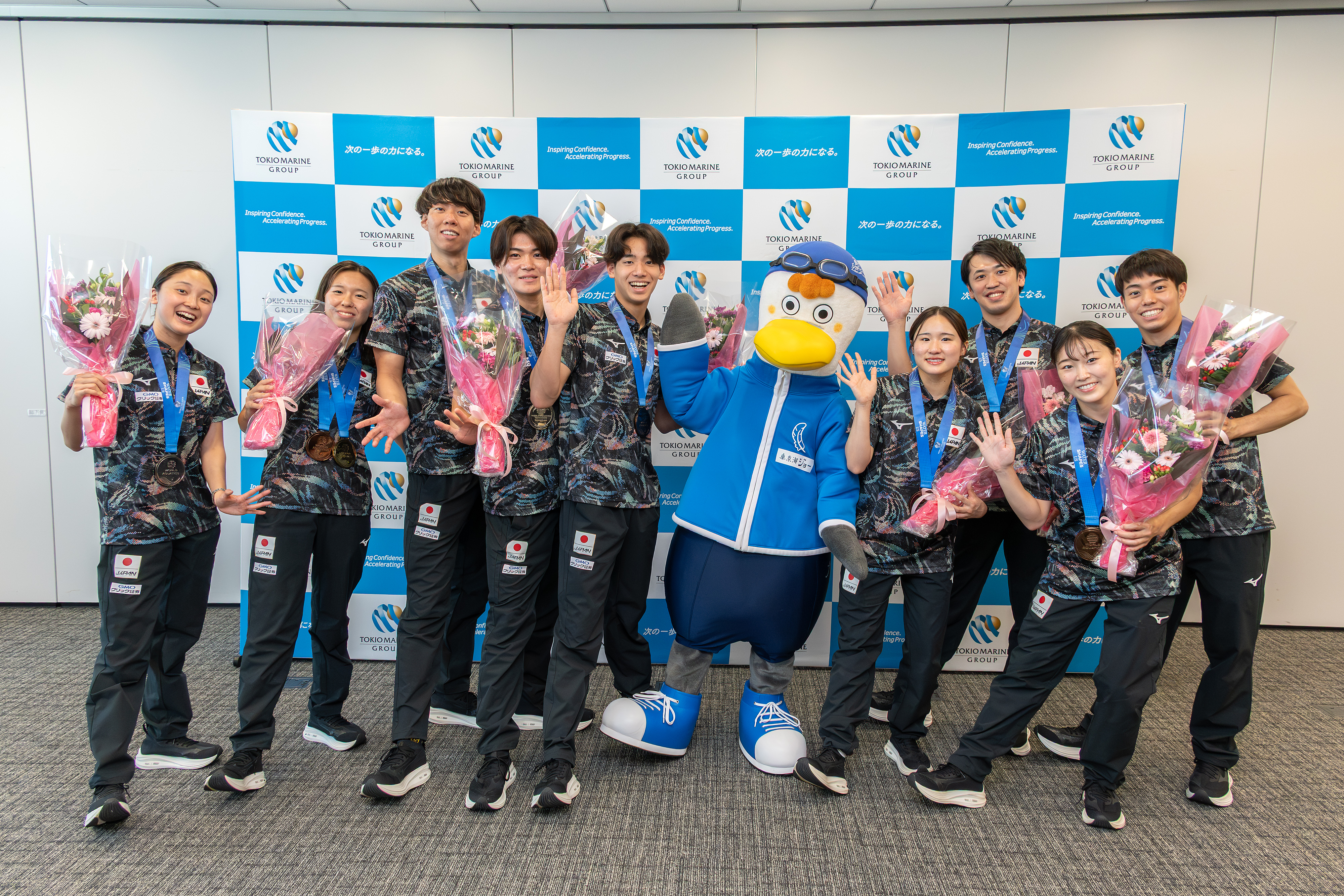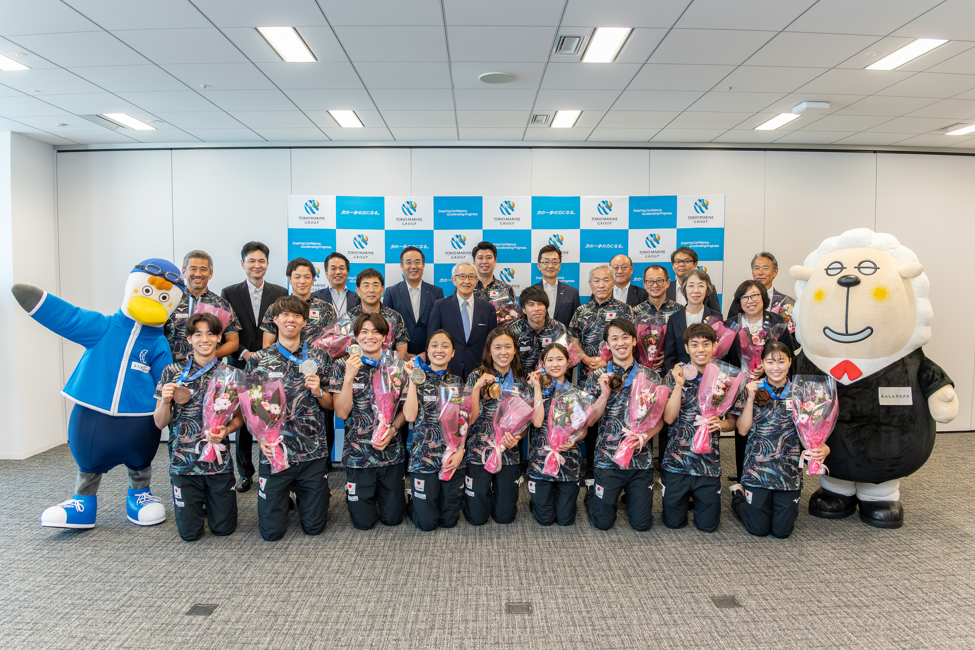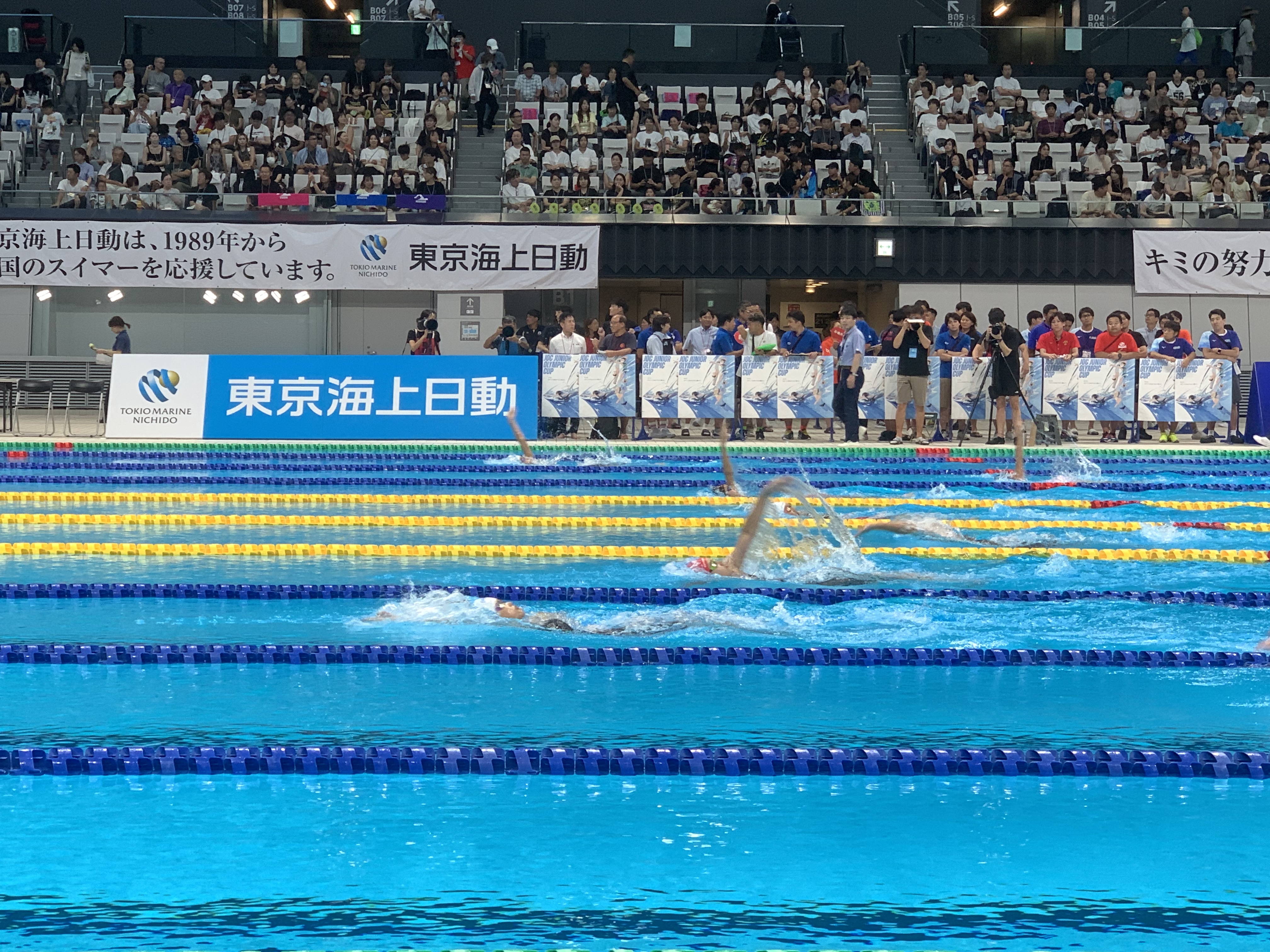 東京海上日動企画は、オリンピアンや日本代表選手と一緒に泳ぐ「ふれあいリレー」と、参加チーム同士でタイムを競いながらジュニアオリンピックの記録を目指す「チャレンジリレー」の2種目を実施し、約210名の方にご参加いただきました。他にも、競泳・アーティスティックスイミング・水球のエキシビションや体験教室などさまざまなプログラムが実施され、会場は大いに盛り上がりました。